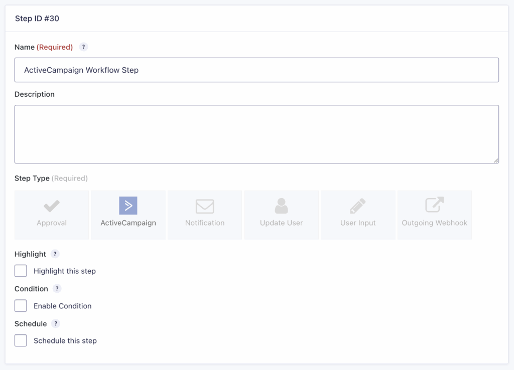 | Step Type | Defines this step as an ActiveCampaign step. Required |