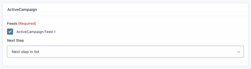 | ActiveCampaign Feed | Selects which ActiveCampaign feed to execute for this step. Required |