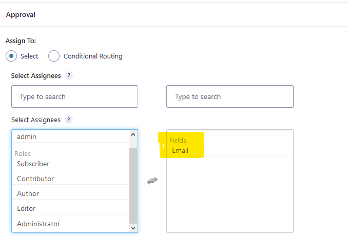 When a form has email fields, they will appear in the ‘Fields’ section of the list of assignees that can be selected.