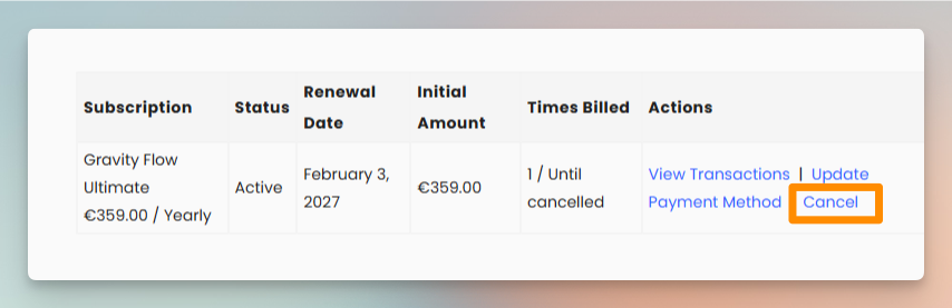 As per our terms, subscriptions are renewed automatically until canceled. Your subscription can be canceled straight from your account area on https://gravityflow.io/account with just a few steps: