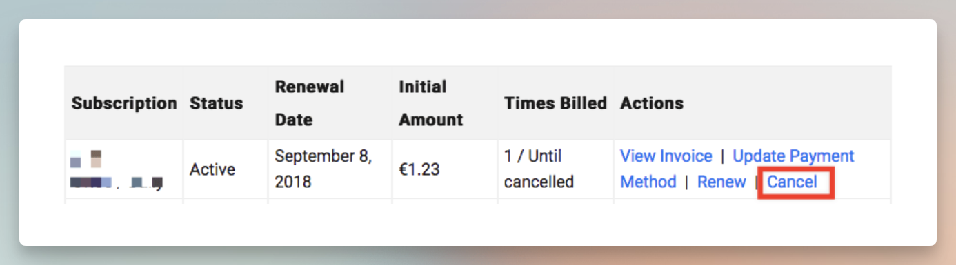1. Find the active subscription you want to cancel in the table and click Cancel