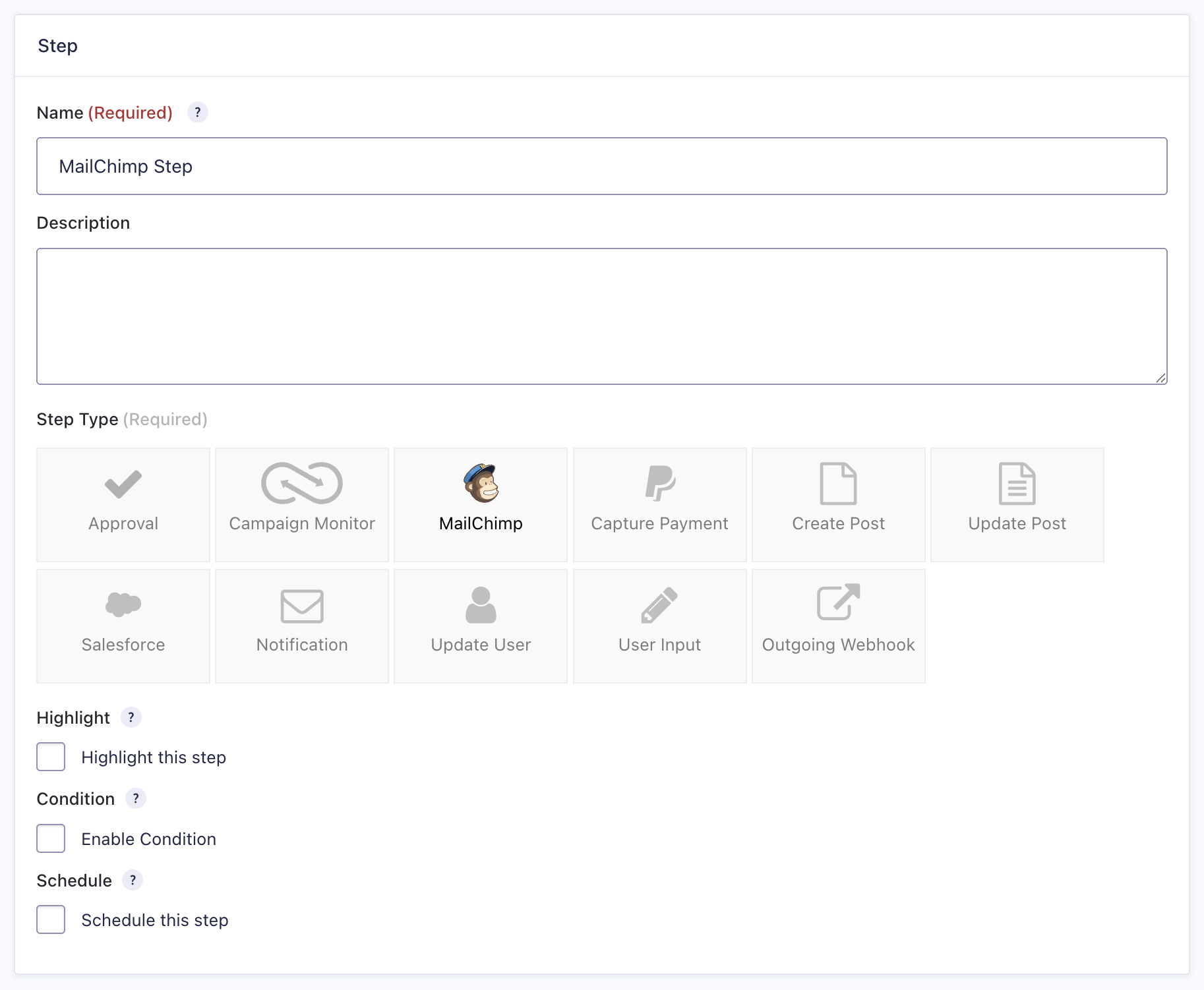 When a workflow includes a Mailchimp step, Gravity Flow ensures that the standard post-submission Mailchimp feed will not execute independently of the workflow. This provides complete control over when Mailchimp actions are performed within the workflow.