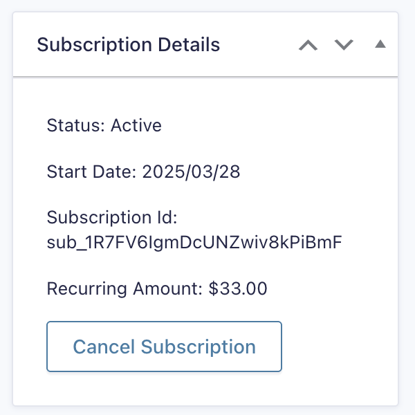 Customers typically know their entry ID (for example, “Order #12345”) but not their Stripe subscription ID (format: sub_xxxxxxxxxxxx). If you need customers to initiate cancellation or management requests based on a subscription created via a separate Gravity Form, you’ll need to: