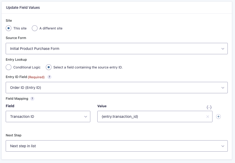 If you need to reference a transaction from a previous form submission (where the customer only knows their entry ID, not the Stripe transaction ID), you can use the Form Connector Extension with an Update Fields step. After defining the Entry Lookup criteria to identify the previous entry, you would use the {entry:transaction_id} merge tag in the Field Mapping value column to store its’ transaction ID into the transaction ID field of the current entry.