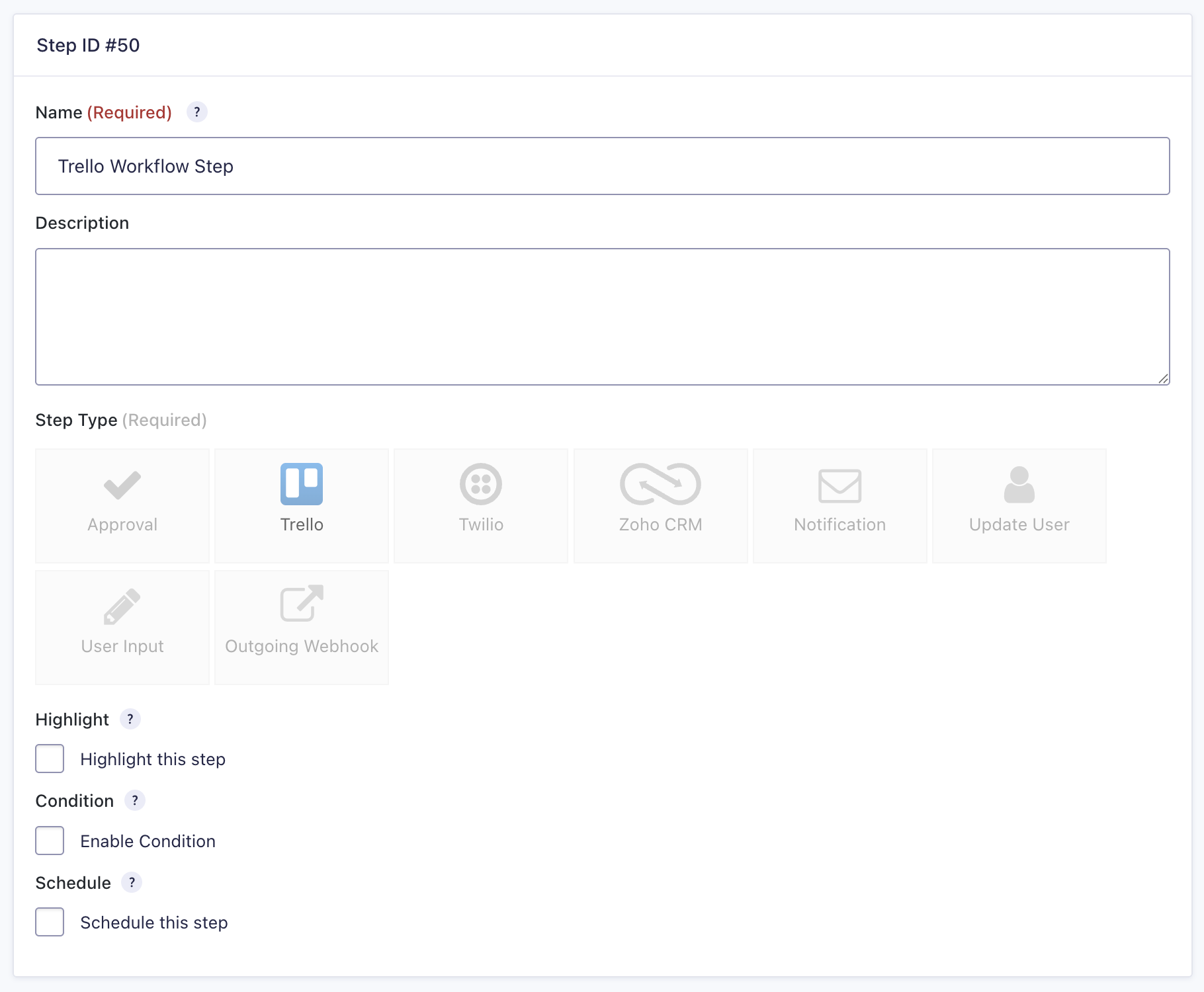 | Name | Defines the workflow step name used to identify it within the workflow. Required |